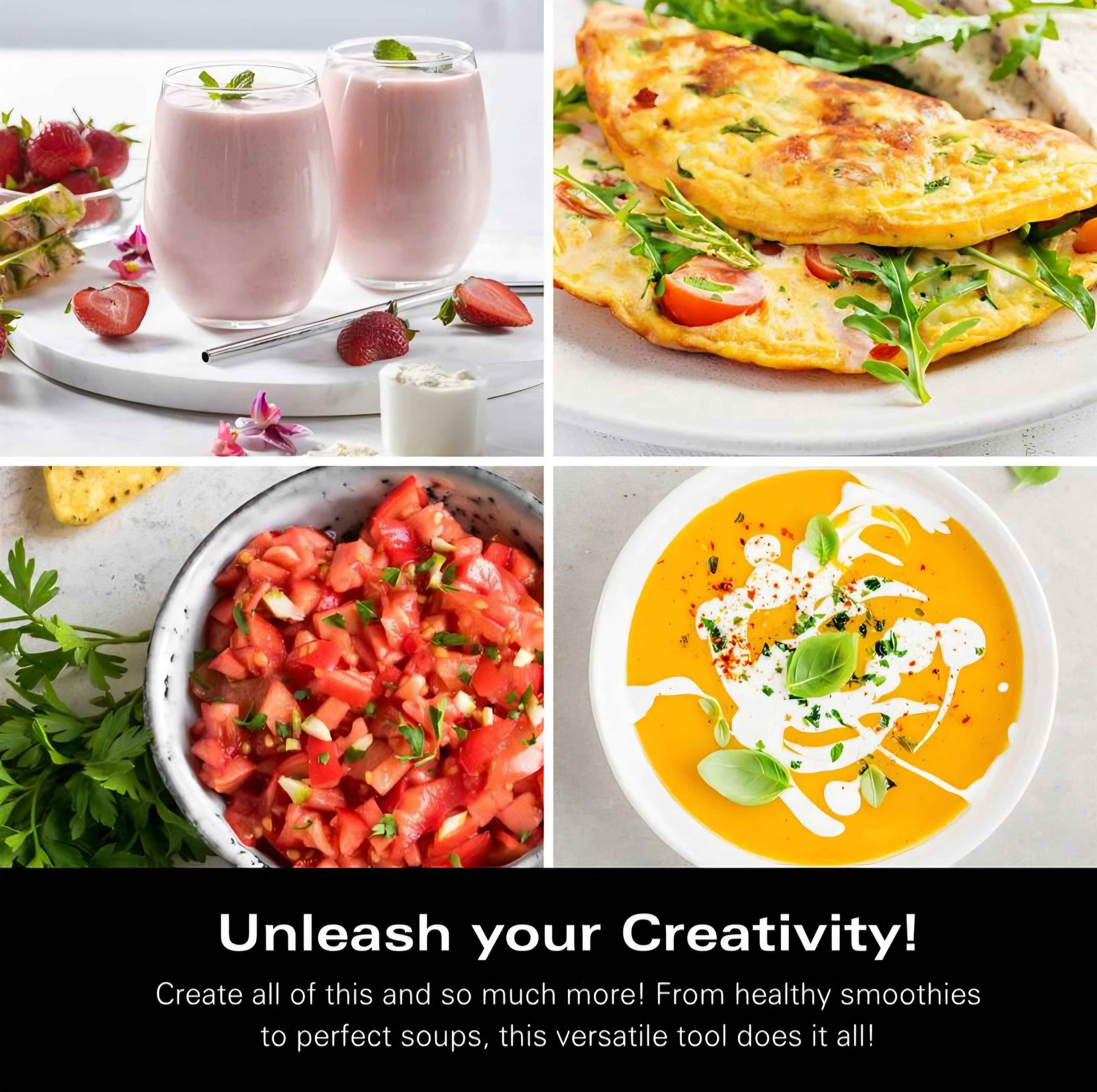4-in-1 Versatility: This multifunctional set includes four attachments — a blending wand, whisk, food chopper, and beaker — giving you the flexibility to blend, whisk, chop, and mix with a single appliance. Perfect for soups, smoothies, dips, and dressings.